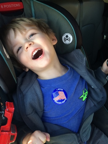 On Super Tuesday, Eric and I (and his red and blue monster trucks) showed to the polls early (7 am). We were greeted by 15 friendly volunteers...and no other voters. So much for the long lines! But we did our civic duty and both got stickers. Go Hillary!
